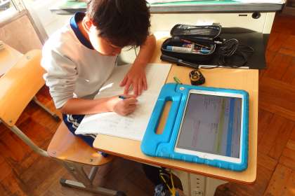 タブレットから連絡を写す3年生です。