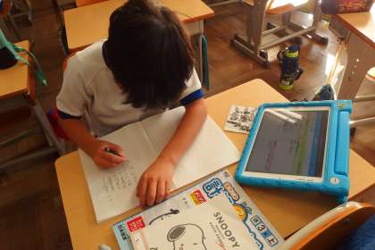 タブレットから連絡を写す3年生です。