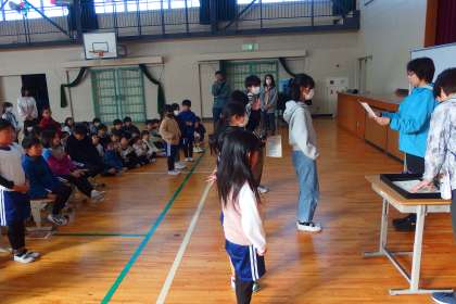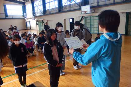 全校集会を行いました。 校内カルタ大会の表彰を行いました。