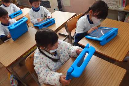 タブレットからアンケート(Forms)に答えている1年生です。