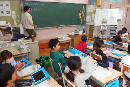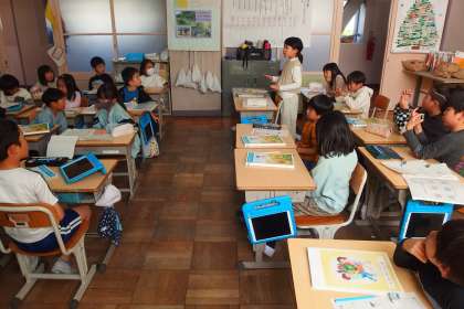 まとめを記入したタブレットを参考にしながら発表している児童もいました。