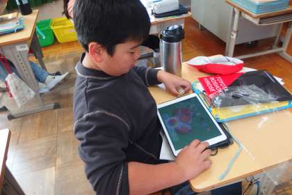 校外学習から帰ってきた5年生が、さっそくタブレットを使ってまとめをしていました。