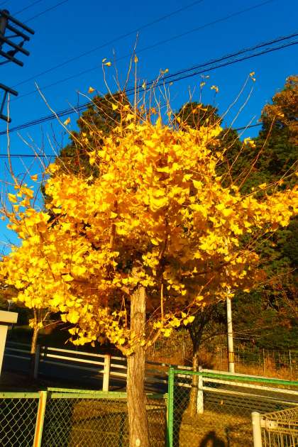雲ひとつない青空にイチョウの黄葉が映えます。