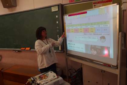 3年生の社会の授業です。 タブレットから資料を提示しています。