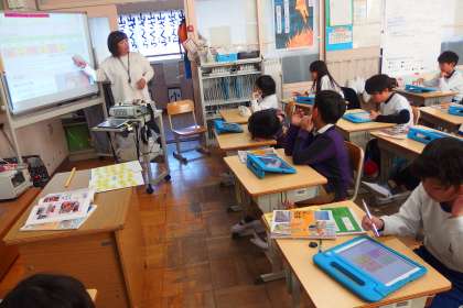 3年生の社会の授業です。 タブレットから資料を提示しています。