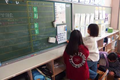 背面黒板に今週の生活のめあてを記入している5年生です。