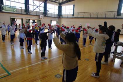 12月10日 大なわエイト 公開日 2024/12/10 更新日 2024/12/10 学校行事 なわとび大会「大なわエイト」を開催しました。 準備運動のラジオ体操はもちろんタブレットから流しています。