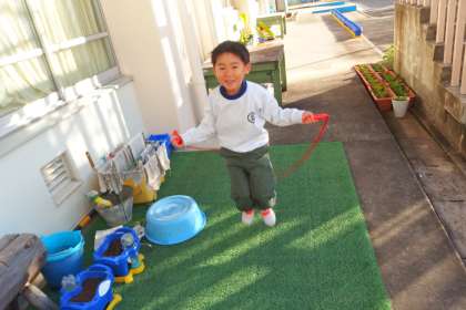 朝から縄跳びの練習中。