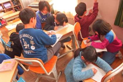 校外学習に向けて話し合い中の3年生です。
