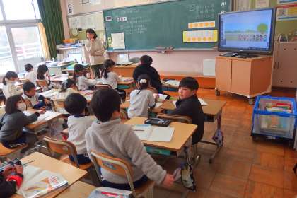 1年生の算数の授業です。 スクリーンに提示されているのはデジタル教科書です。