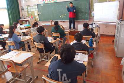 6年生の算数の授業です。 スクリーンに提示されているのはデジタル教科書です。
