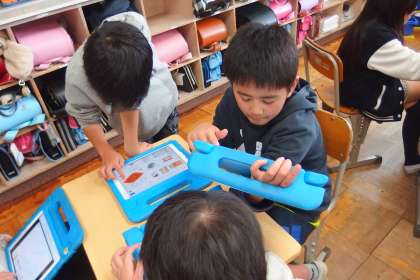 SDGsに関連することをタブレットで調べ議論をしている4年生です。