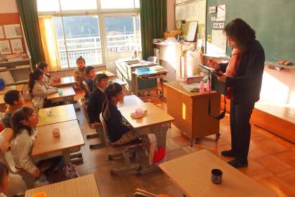 1年生の朝の会の様子です。 担任の先生はタブレットで連絡を確認しながら伝えています。