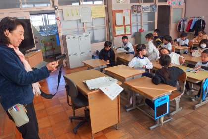1年生の朝の会の様子です。 担任の先生はタブレットで連絡を確認して子どもたちに伝えています。