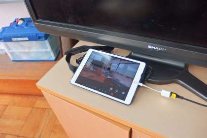 タブレットをつないでオンライン集会に備えている1年生の教室です。