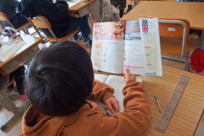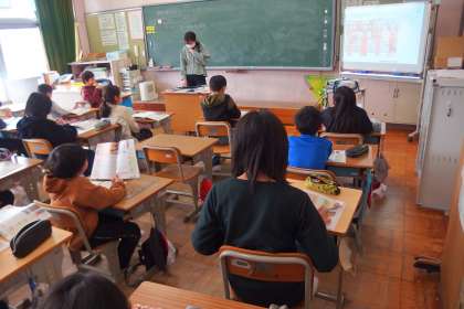 4年生の社会の授業です。 スクリーンに映っているのはデジタル教科書です。