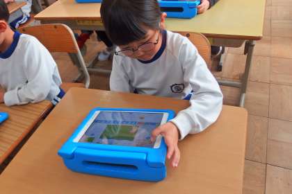 ICT支援員のサポートを受けながら、1年生がタブレットでプログラミングを学ぶアプリに挑戦しました。