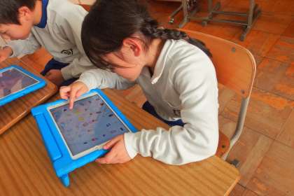 ICT支援員のサポートを受けながら、1年生がタブレットでプログラミングを学ぶアプリに挑戦しました。