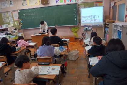 4年生の保健の授業です。 タブレットに手書きした内容がスクリーンに映し出されています。