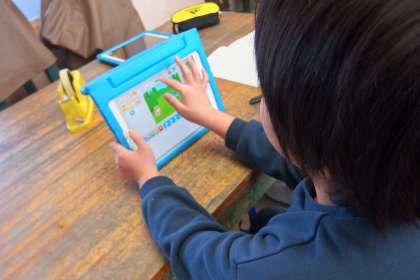 タブレットでプログラミングのアプリをしているところです。
