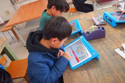 タブレットでプログラミングのアプリをしているところです。
