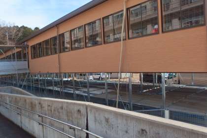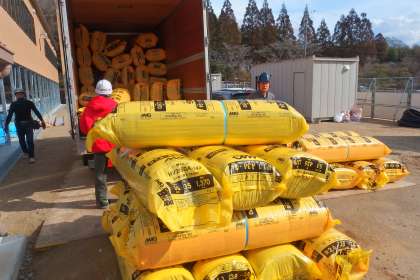今日の校舎増築工事の様子です。 大量の断熱材が運び込まれていました。