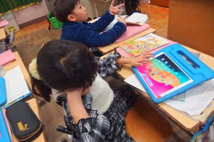 週末に取り組んだ宿題をタブレットで開いて発表するところでした。