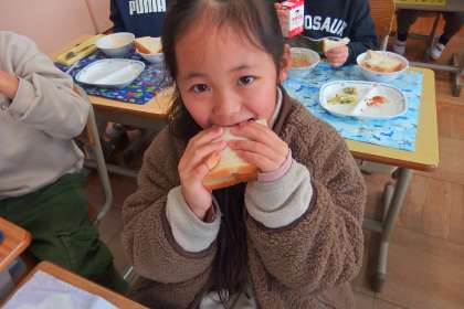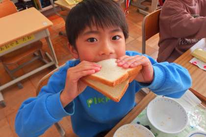 「えびかつサンド」をガブリとおいしそうに食べている1年生です。