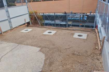今日の校舎増築の付随工事の様子です。 渡りろうかの新設に伴い、国旗掲揚塔も移築となっています。