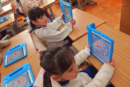 タブレットのアプリを使って算数の復習をしている1年生です。