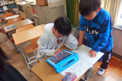 学習発表会に向けて準備をしている4年生です。 まとめをしたタブレットを中心にグループで練習中です。