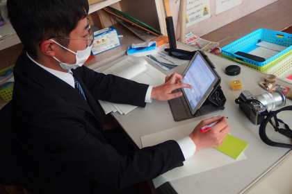 児童の発表をサポートするためにタブレットを操作している担任の先生です。