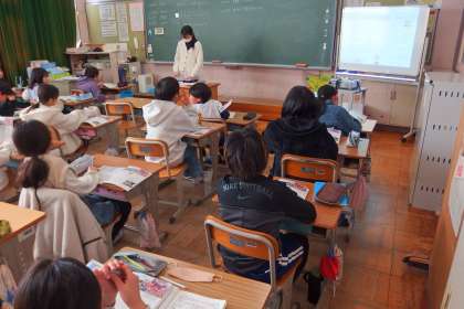 4年生の社会の授業です。 スクリーンに映っているのはデジタル教科書です。