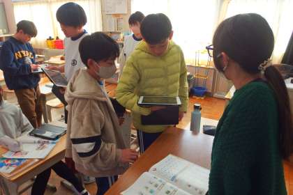 タブレットの画像を紹介しながらALTの先生と英会話を練習しました。