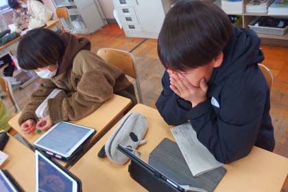 タブレットの気づきメモを使って考え、意見を共有しています。