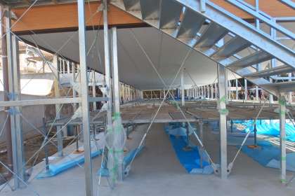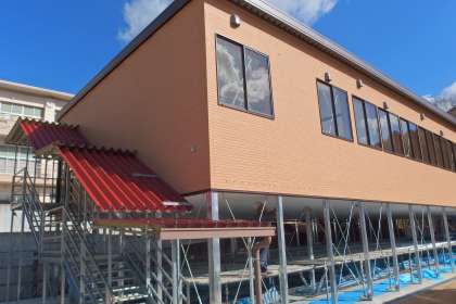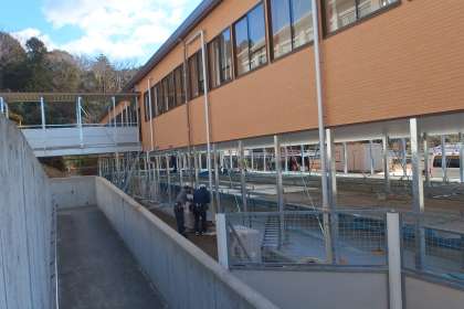 校舎増築工事の様子です。 内装工事や天井の仕上げ、エアコンの室外機の設置などが行われています。