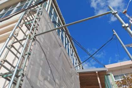 体育館へのエアコン設置工事については、写真の電線の引き込み工事の後は、ほとんど進んでいません。