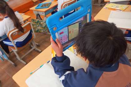 各班のまとめをタブレットで共有しています。