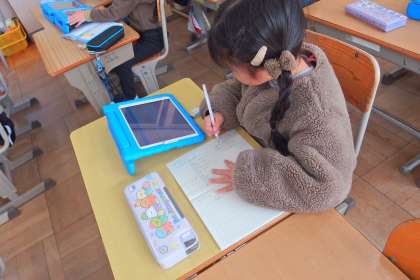タブレットから連絡を写す1年生です。