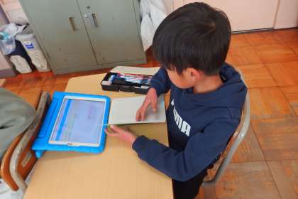 タブレットから連絡を写す1年生です。