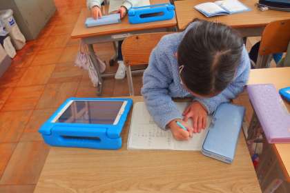 タブレットから連絡を写す1年生です。