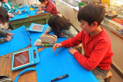 3年生の図工の授業です。 下書きのデザインアイデアをタブレットで検索しながら進めています。