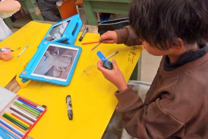 3年生の図工の授業です。 下書きのデザインアイデアをタブレットで検索しながら進めています。