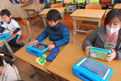 タブレットから連絡を写す1年生です。