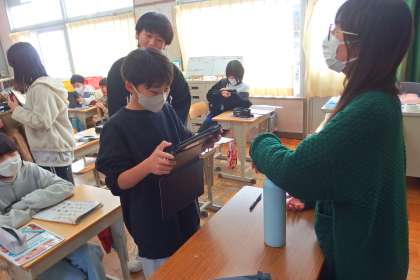 タブレットの画像を紹介しながらALTの先生と英会話を練習しました。