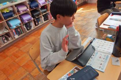 6年生の英語の授業です。 ALTの先生に出題するスリーヒントクイズをタブレットで作成しています。