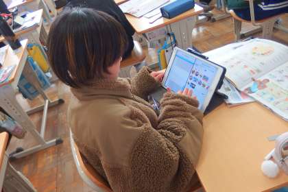 6年生の英語の授業です。 ALTの先生に出題するスリーヒントクイズをタブレットで作成しています。