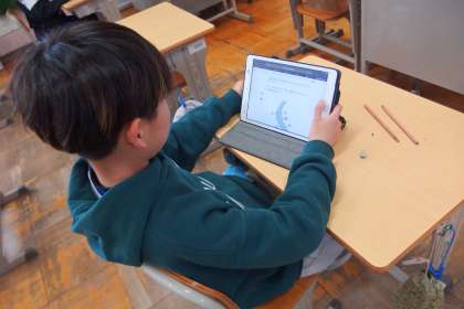 5年生の英語の授業です。 ALTの先生に出題するスリーヒントクイズをタブレットで作成しています。