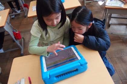 タブレットから連絡を写す3年生です。