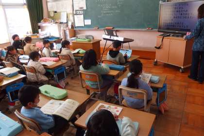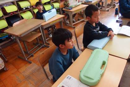 1年生の音楽の授業です。 タブレットから歌詞を提示して、メロディを流して歌の練習をしていました。